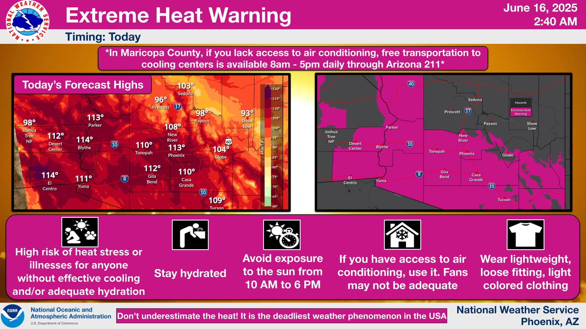 As far as heat this week, the heat that started over the weekend over the Southwest (114F high at Phoenix Sunday, just one degree shy of a record) will continue today, with extreme heat warnings in effect. Fire danger will also be a concern for much of the Southwest the next couple of days. The heat will back off a little for a day or two, but then rebuild and expand northeast for the middle and later part of the work week.