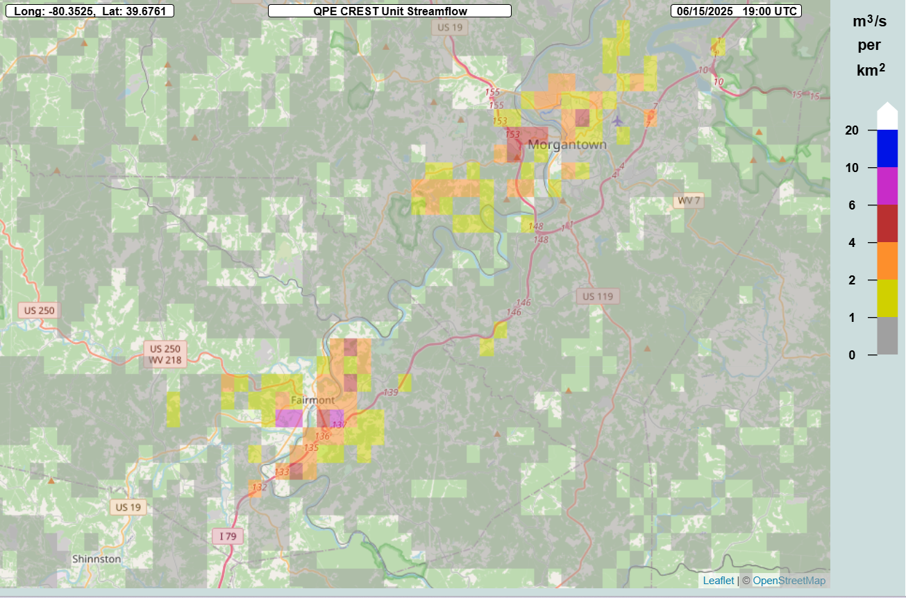 The MRMS FLASH unit streamflow hydrology product, which shows the amount of immediate runoff and inundation due to rainfall, showed the rapid runoff with values approaching 10, indicative of potentially significant flash flooding. These extreme rainfall rates in the steep Appalachian terrain are particularly dangerous, as the runoff feeds into valleys causing rapid inundation of low lying areas and extremely quick rises of streams and creeks out of their banks.