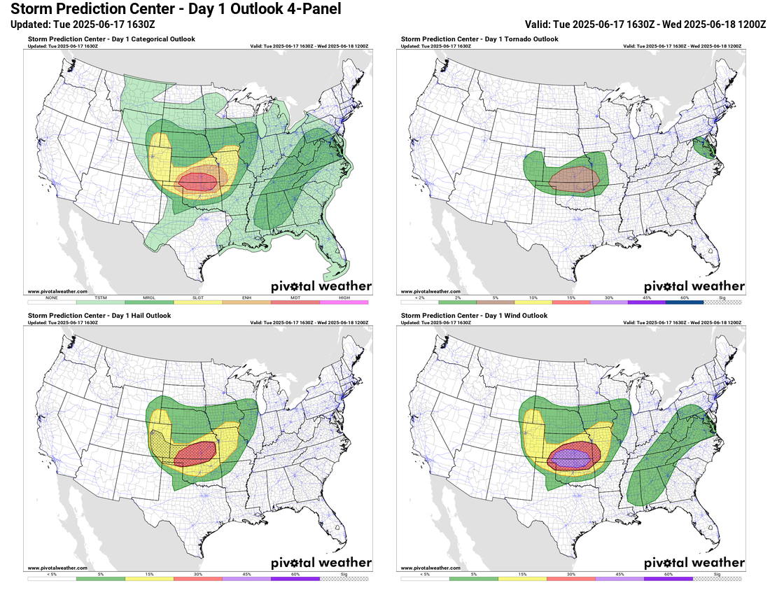 The progress of the severe weather overnight will play a significant role in the severe weather today, as those storms have pushed a boundary south into Oklahoma. This boundary will likely start to shift back a bit north during the day, and will be the primary focus for rapid severe thunderstorm development with daytime heating. Scattered intense supercell storms are expected to develop with very large hail, damaging winds and tornadoes. Eventually, as transpired last night, these storms will likely evolve into a line of severe storms that should produce widespread, significant damaging winds. The NOAA Storm Prediction Center (SPC) has placed a moderate (level 4 of 5) risk of severe weather across southern Kansas and northern Oklahoma for this afternoon and tonight. The high resolution models differ on how far south and east the threat of significant severe winds will progress overnight, but folks in Arkansas and southern Missouri should stay up to date on forecasts this evening.