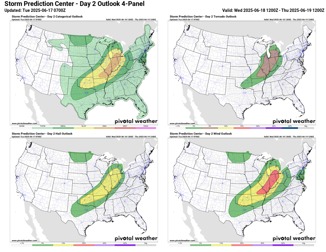 Another active severe weather day is anticipated Wednesday, as the disturbance responsible for today’s storms will initiate an intensifying area of surface low pressure that will move into the lower Great Lakes region. Depending on the eventual track and how much destabilization occurs near this low, an enhanced tornado risk could develop across parts of lower Michigan and northern Indiana. Additionally, a band of severe storms is expected along the trailing cold front which should present a risk of damaging winds.