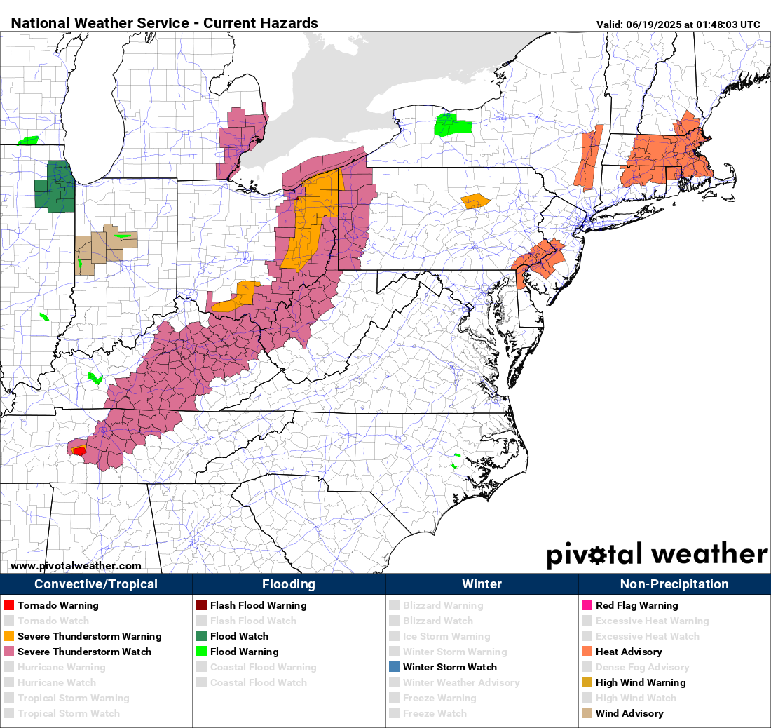 The line of severe storms continues to press east across Ohio, with severe thunderstorm and tornado warnings in effect. Severe thunderstorm watches are in effect from Lake Erie to middle Tennessee. The storms should weaken over the next few hours as they move east into more stable air.