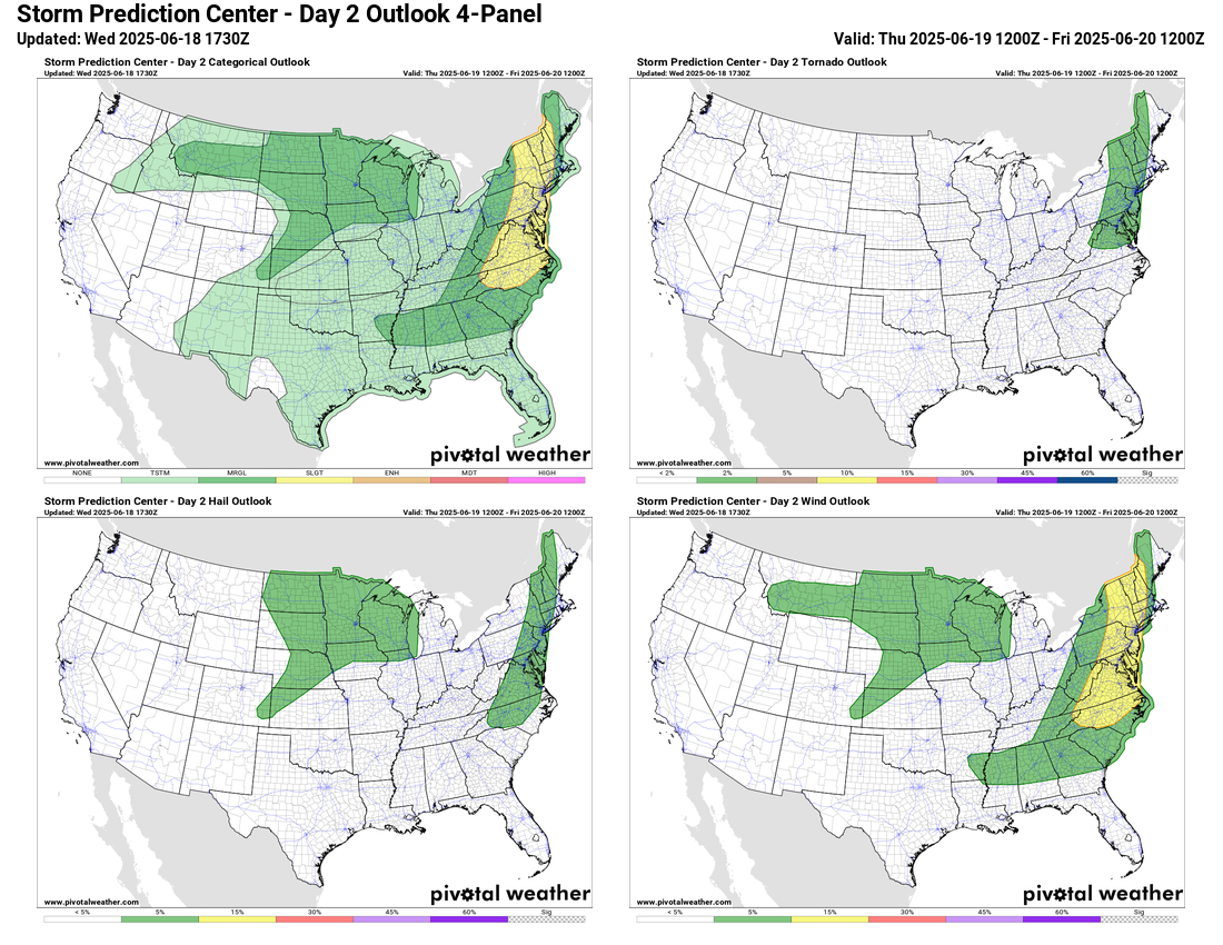Bands of storms should reintensify during the day Thursday as the system moves east, and a slight (level 2 of 5) risk of severe storms is in place from northern New England south to North Carolina.