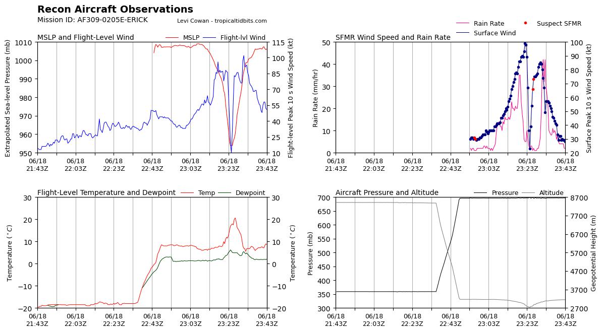The other major news this evening is that Erick has strengthened into a major hurricane in eastern Pacific. A reconnaissance aircraft pass through the storm this evening found that the central pressure of the storm had dropped about 20 millibars since this morning, down to 953 mb, and found surface winds of 100 knots. The NHC official intensity has been increased to 120 mph, a category 3 hurricane.