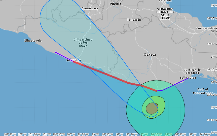 NHC is forecasting Erick to continue to intensify up through landfall, which is now expected to be a bit earlier – Thursday morning – and bit farther east than earlier forecasts, likely in the general vicinity of the border between the states of Oaxaca and Guerrero. Devastating wind damage is expected near where the core of the hurricane crosses the coast, with a significant storm surge near and to the east of the landfall point. Once it moves inland, the circulation will rapidly weaken over the mountainous terrain, but the heavy rainfall produced by Erick over that terrain will result in life-threatening flash flooding and mudslides.