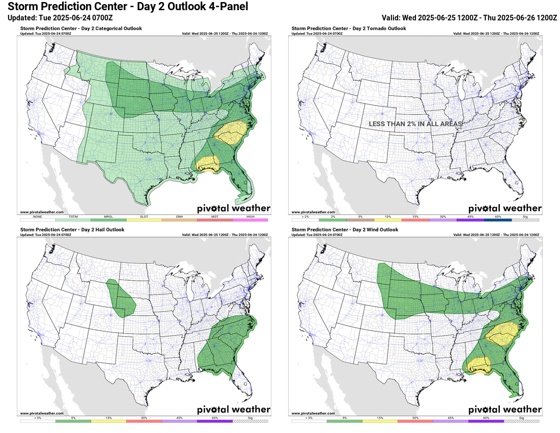 On Wednesday, a slight (level 2 of 5) risk is forecast for parts of the Southeast as the upper high begins to break down and an upper level low pressure area approaches the region from the southeast. The atmosphere will become quite unstable with plenty of heat and humidity still in place, and scattered severe storms primarily capable of damaging downburst winds are expected. A marginal risk will again be in place along the slow moving front from the Northeast to the northern Plains. Given that pockets of strongly unstable air will likely develop in this region, a few spots may need to have higher probabilities in later forecasts.