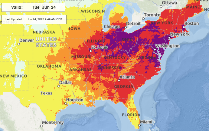 Today still looks as if it will be the peak of the heat wave as far as intensity and areal extent, with widespread major to extreme heat risk across most of the eastern half of the country. Dozens more records will be set again today.