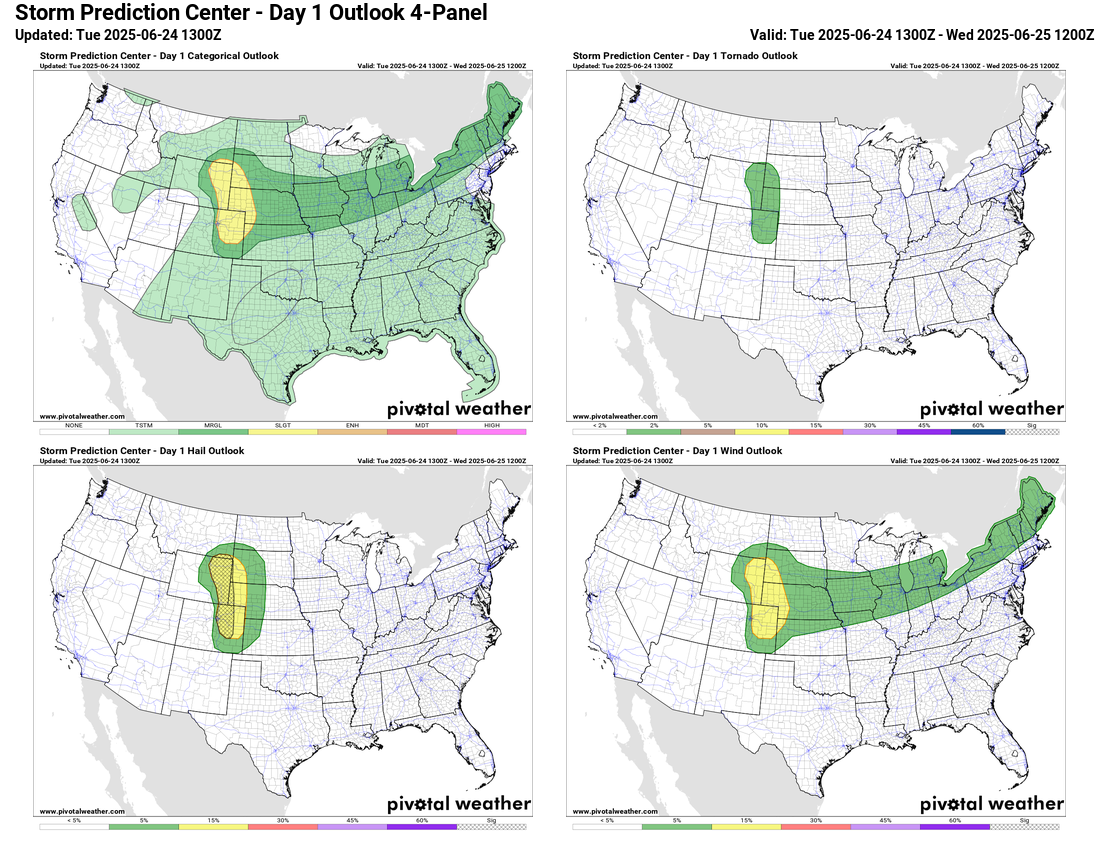 As far as severe weather is concerned, the primary focus today will be in the High Plains where scattered supercell storms capable of producing very large hail, strong downburst winds and a few tornadoes are expected this afternoon and evening. A marginal (level 1 of 5) risk extends east from there into the Northeast ahead of the slow moving cold front.