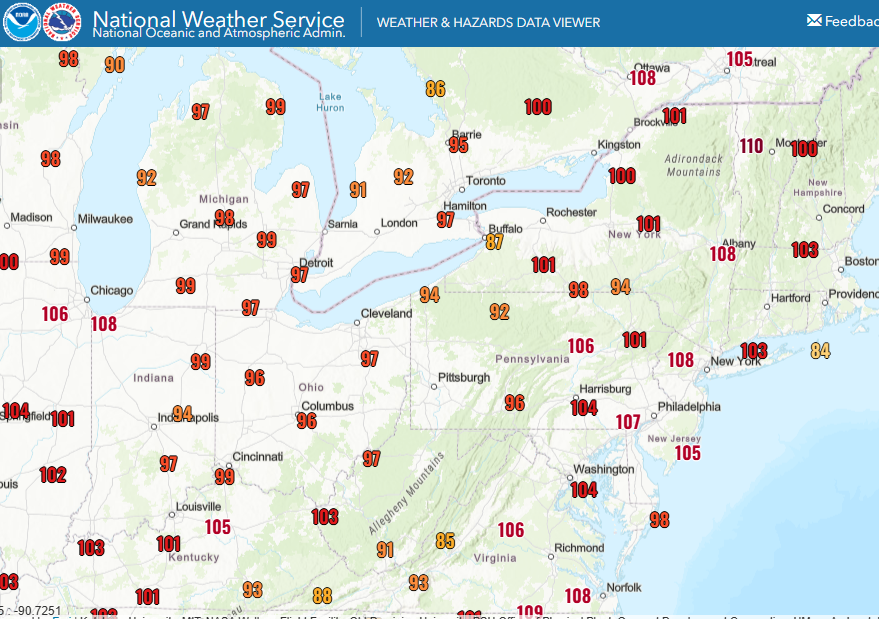 The heat across the eastern half of the country definitely was the major weather story of the last 24 hours, and will continue to be so today. The map above shows the observed heat index at 3 pm CT; this map only plots the main NWS/FAA/NOAA sites as temperature and particularly dewpoint observations tend to not be as well calibrated at non-federal sites and can show erroneously high values. Widespread values greater than 100 in the Midwest are apparent, and then also in the Northeast and Mid-Atlantic regions.