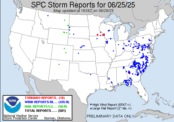 Wednesday ended up being a bit busier of a severe weather day than anticipated. The expected clusters of severe storms in the Southeast produced numerous incidences of wind damage, but there were also quite a few severe storms with damaging wind gusts reported in the Mid-Atlantic and upper Ohio Valley regions as well. Several tornadoes occurred in southeast Minnesota associated with a complex of severe storms that moved through the region Wednesday evening.