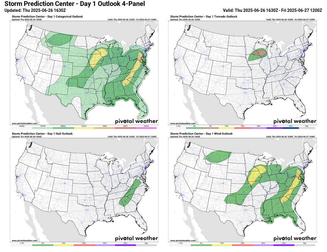 Today will see severe weather risks in similar areas, with a slight risk (level 2 of 5) in the Mid-Atlantic and parts of the Southeast primarily for scattered severe storms capable of producing damaging downburst winds. A slight risk is also in place in the upper Midwest for storms capable of damaging winds and potentially a few tornadoes.