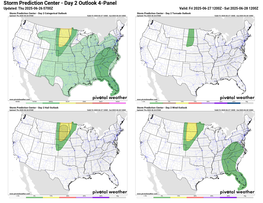 While a marginal risk of severe storms with damaging downburst winds will continue in the hot and humid Southeast, on Friday the main severe weather risk should shift to the northern Plains, where severe storms capable of very large hail and damaging winds are possible.