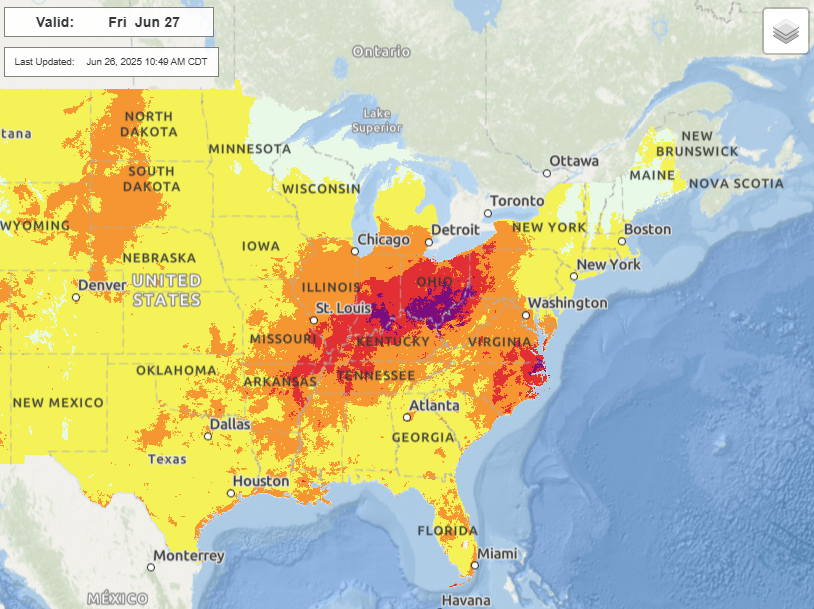 As we end the work week on Friday, the heat dome will continue to erode, but the core will remain over the Ohio Valley and parts of the Mid-Atlantic where major to extreme heat risk will persist for one more day.