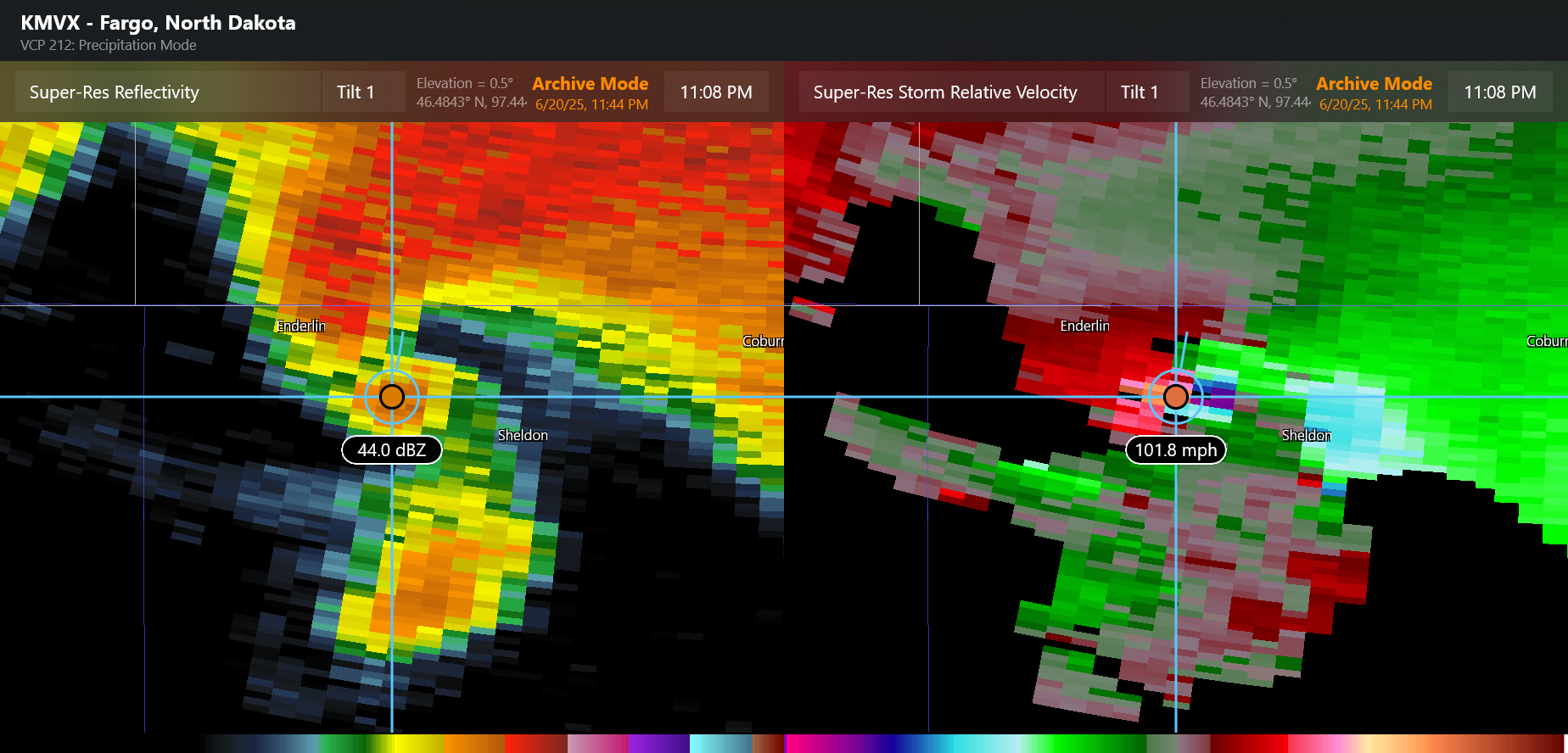 For those of you that follow me on BlueSky, you saw me post extensively Friday night and over the weekend about the severe weather late Friday in North Dakota, and how impressive it was to me meteorologically. One of the intense events that evening was the tornado that occurred shortly after 11 pm CT just southeast of Enderlin, ND. The above radar image is from 11:08 pm, close to when the tornado was likely at its most intense. The Grand Forks WSR-88D (NWS Doppler radar) detected 122 mph inbound winds adjacent to 102 mph outbound winds within the circulation associated with the tornado. This yields a gate-to-gate rotational velocity value – the difference between inbound and outbound velocity divided by 2 – of 92 knots (106 mph), which is an upper echelon value for this parameter.