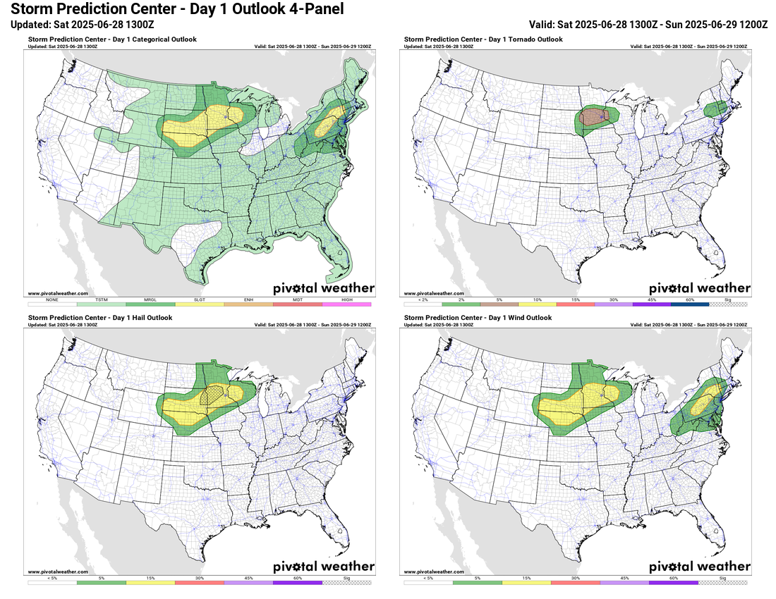 The severe weather risk areas and threats will actually be rather similar on Sunday as today. In the Northeast, the risk will be a bit lower and farther east than today, with a few severe storms with damaging downburst winds being the primary risk.