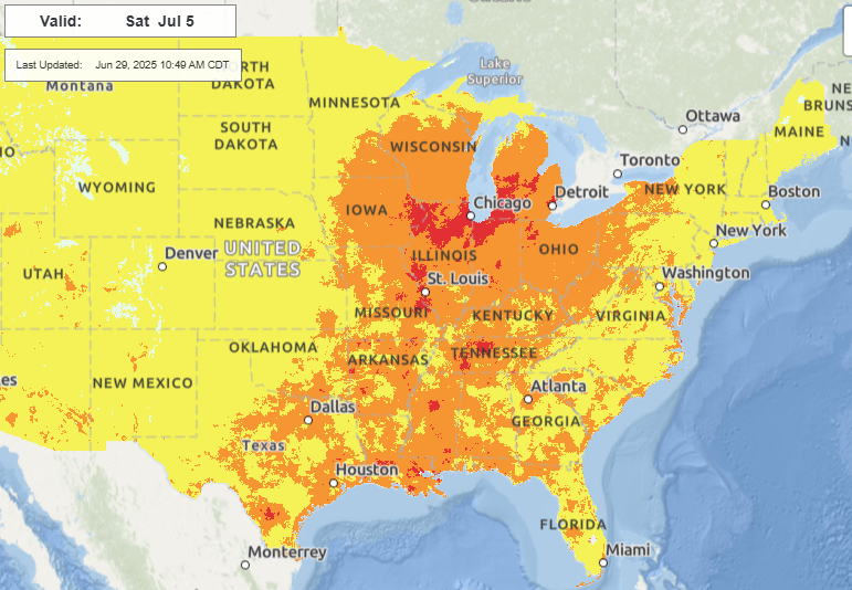 Heat is expected to build and shift east through the week, and by the holiday weekend widespread moderate to major heat risk is expected in the Midwest and South.