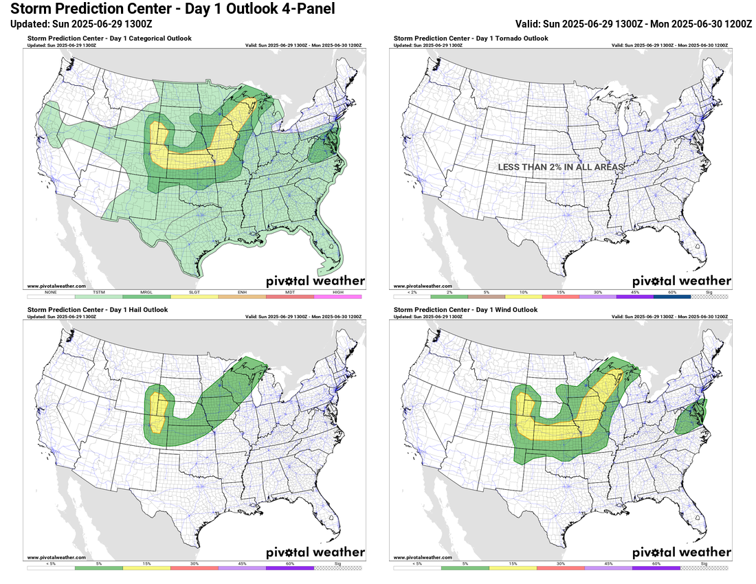 Today, the risk of severe weather should be a bit less than Saturday, with a slight (level 2 of 5) risk across parts of the Midwest and Plains, primarily for damaging winds and some risk of large hail. A marginal (level 1 of 5) risk is in place for the Mid-Atlantic region for the possibility of a few severe storms with damaging downburst winds.