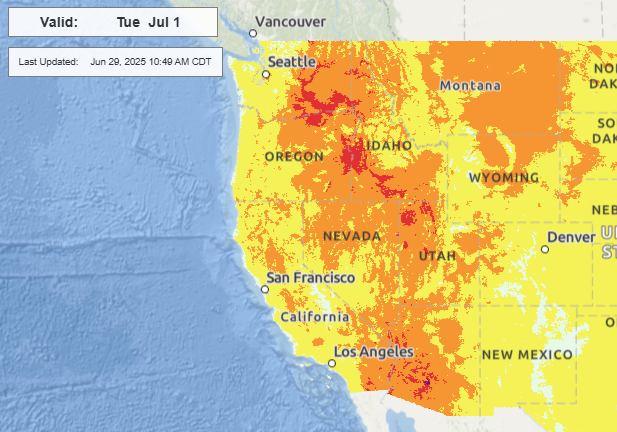 While the eastern US heat dome has weakened, hotter conditions have been redeveloping in the western United States, and heat advisories and extreme heat warnings are in effect for a number of inland areas. Phoenix is expected to approach or exceed 115F the next few days, with the western heat reaching a peak on Tuesday as shown above.