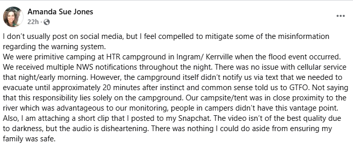 I am sorry, you do not get to have it both ways: you cannot say “this is the most dangerous river valley in the United States” and then act like what happened was a total shock. This exact river valley has had similar catastrophic floods in the past, including the July 1987 flash flood that killed 10 teenage campers and resulted in 33 having to be airlifted from trees and flood waters. Kelly also said: