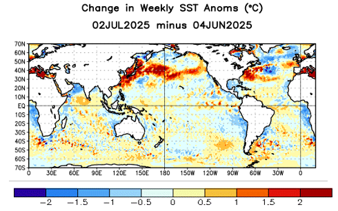 The change in global sea surface temperature (SST) anomalies (amount the temperature is above normal) shows that anomalies have weakened from record warmth in the Gulf and northwest Caribbean, but SSTs are still well above normal in these areas. The rest of the Atlantic basin has seen warming over the last month and above normal SSTs appears as if they will be in place for most of the Atlantic as we approach the peak of hurricane season. While this is by no means a guarantee of an active season, above normal SSTs, particularly in the Main Development Region (MDR) east of the Caribbean, is one of the primary signs of a potentially above normal season.