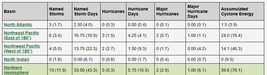 Eastern Pacific activity so far this season is somewhat above normal, with Accumulated Cyclone Energy (ACE) – the most useful parameter for judging the overall seasonal activity based on length, size and intensity of each storm – now at 130% of normal. The most notable trend in global activity though has been below normal activity in the western Pacific, where ACE is 30% of normal.