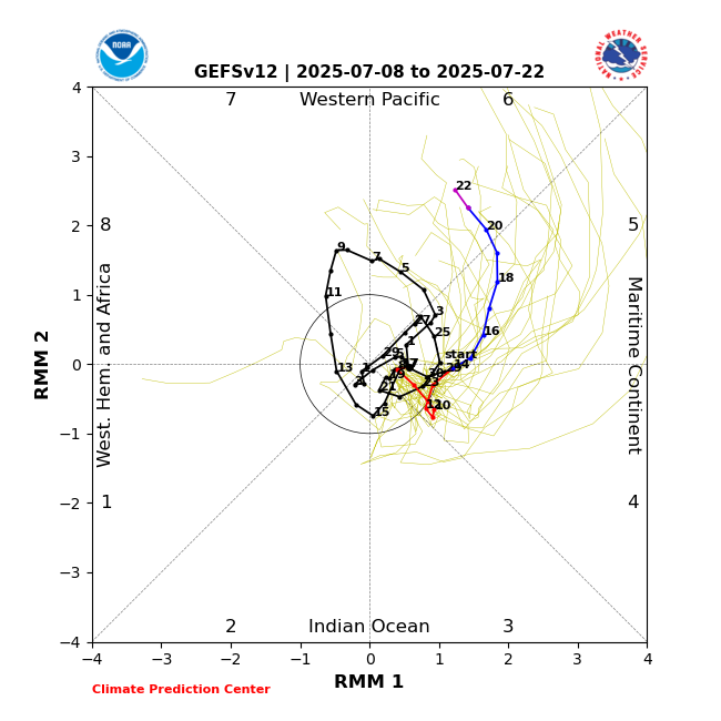 The Madden-Julian Oscillation – the large scale global tropical feature that governs more favorable periods and regions for tropical activity – has been weak for several weeks, but model forecasts suggest it will become more active again over the next 2 weeks. The models show it strengthening and moving into phase 6 by the middle to later part of the month, which should further favor tropical activity in the western Pacific (the graph above shows the intensity and location of the MJO signal with a dot and a number for the date, meaning the model is showing it in phase 6 by July 22nd). Should the MJO become active and continue to propagate east, it could become an enhancing factor for Atlantic tropical cyclone activity as we get closer to the start of peak Atlantic hurricane season in August.
