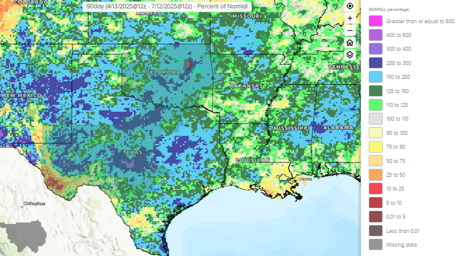 Much of this region has seen unusually large levels of rainfall in the last 3 months, with some spots having seen more than twice their usual levels of rainfall. This has left much of the area vulnerable to flash flooding with heavy rainfall, and the Weather Prediction Center has a large slight (level 2 of 4) risk in place. The risk area does include much of the Texas Hill Country and the Ruidoso, NM area which were all hit by major flash flooding in the last 10 days.