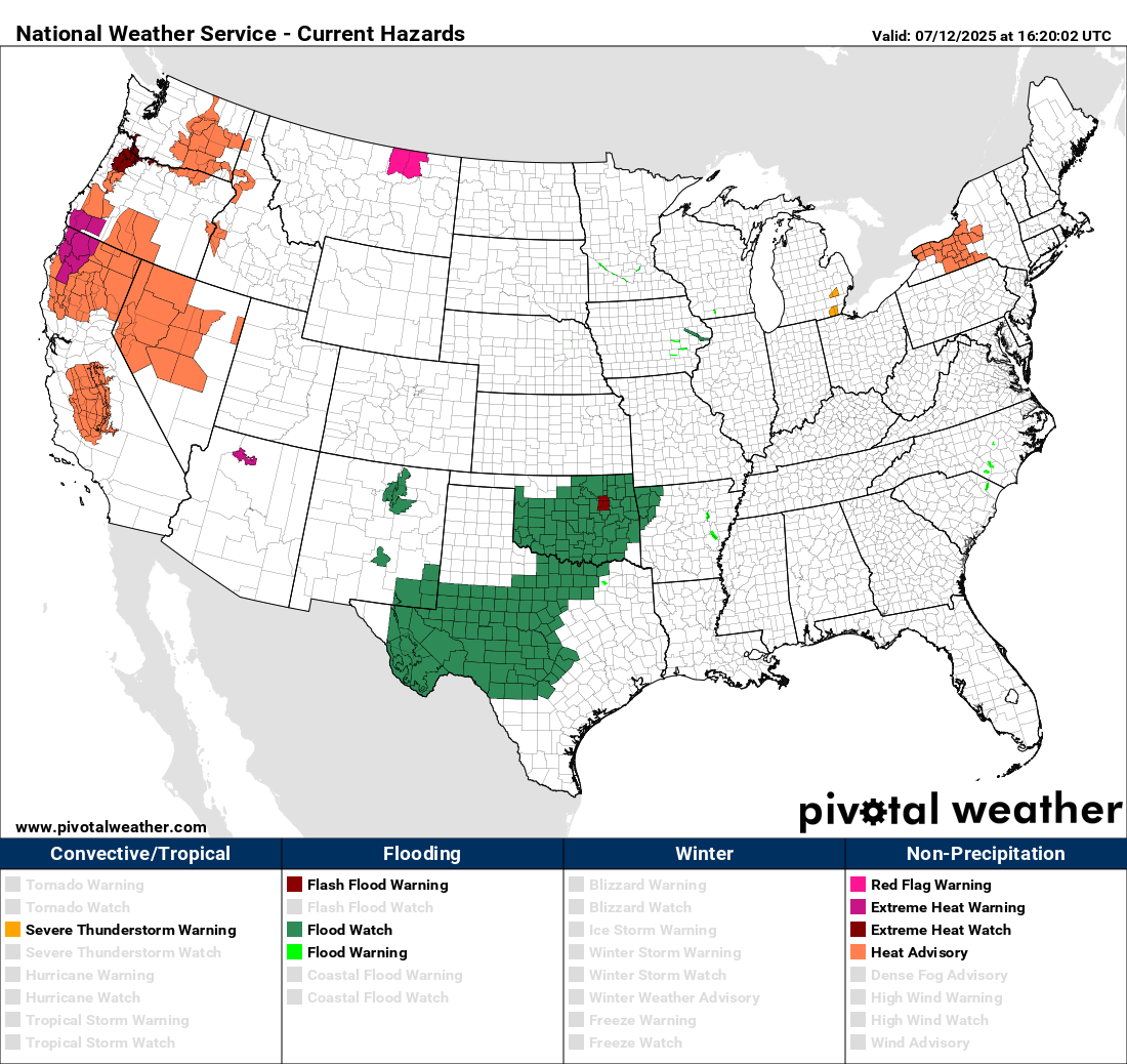 In the West, heat and fire danger continue to be the primary weather hazards, with red flag warnings and heat advisories in effect for a number of areas. Wildfires have been increasing in number and severity in several western states this week. This morning, the National Interagency Fire Center (NIFC) raised the national preparedness level (PL) to 4, which is the second highest level. NIFC reported on their morning report that 7 new large fires were reported on Friday, bringing the total number of uncontained incidents nationally to 34. Alaska has been having a particularly active summer with 60 large fires and a state PL of 5.