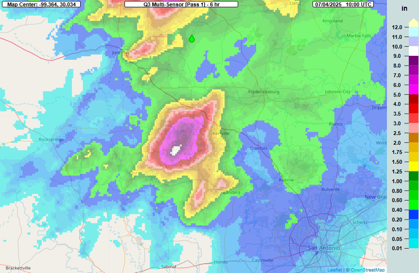 However, anytime a point is made about the “unpredictability” of this event, it needs to be stressed that at a fundamental level a catastrophic flash flood is almost always going to be sudden and unpredictable. Flash floods like this and other historical catastrophic flash floods with large numbers of fatalities such as the 1972 Black Hills flash flood and 1976 Big Thompson Canyon flood are the result of intense, localized rainfall in the precise spot necessary to generate a massive flood wave. The above 6-hour MRMS rainfall from 5 am that morning shows the relatively localized rainfall of 6-10” in just a few hours in the exact area needed to generate the massive floodwave that devastated the region along the Guadalupe River. Bottom line: the state of hydrometeorological science is not such that we can tell you with any significant lead time precisely how much rain will fall and if it will fall in the exact right location to produce a devastating flash flood. This is why it is so critical to have multiple ways of receiving a flash flood warning if you are in the flash flood prone area: the warning might be the first indication you have of potential danger, especially given that in some flash floods the rainfall producing the flood can occur upstream from you and you may be completely unaware that it even fell.