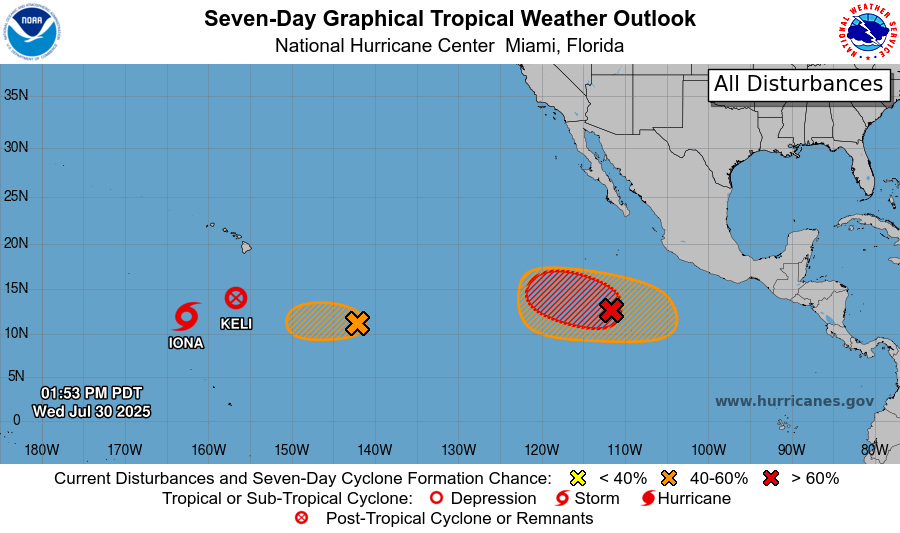 After peaking as a major hurricane yesterday, Iona has weakened rapidly and is now a tropical storm as it moves well southwest of Hawaii. The short-lived tropical storm Keli has degenerated to its east. Another system east of the remnants of Keli could develop into another short-lived system but is not expected to do much. Farther east, the next more significant system to watch is Invest 99P in the eastern Pacific several hundred miles southwest of the southwestern coast of Mexico. 99P is expected to develop into a tropical cyclone in the next couple of days and likely become a hurricane as it moves west northwest. As of now, it appears as though it will not impact any land areas, staying well offshore of Mexico and likely to remain east of Hawaii. The Atlantic remains quiet for now, but signs still indicate a more favorable atmospheric setup for development across the basin starting next week.