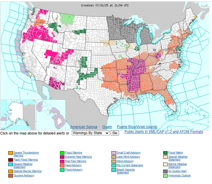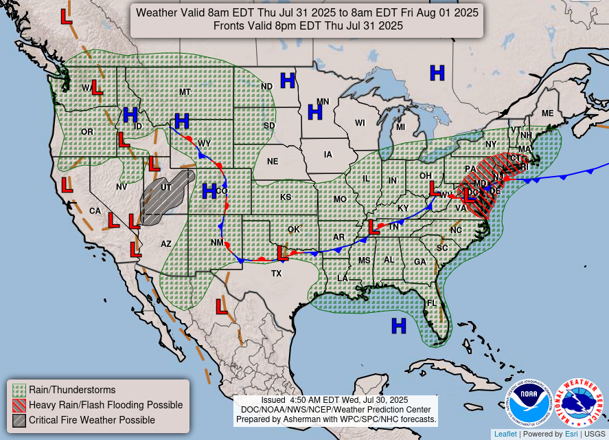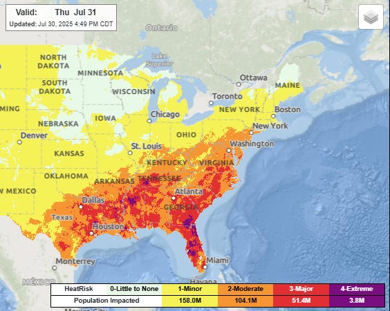 As expected, heat has been the dominant weather story over much of the country the last couple of days, with numerous record warm temperatures – both maxes and mins – set in the eastern United States. A slow moving cold front is slowly bringing relief from the north, but Thursday will be another day with widespread major to extreme heat risk across a broad region from Texas to Virginia and south across Florida.