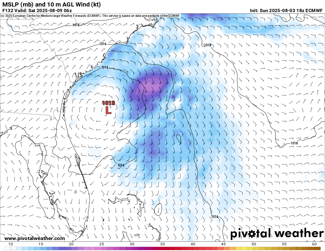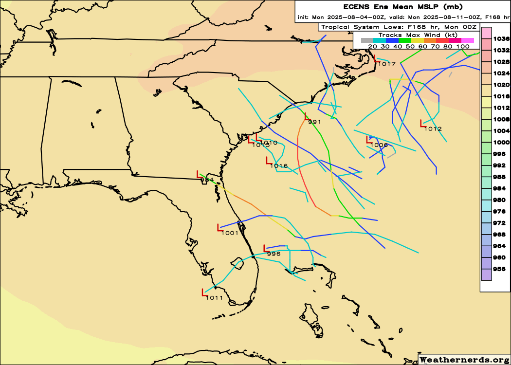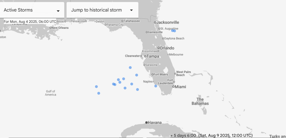 Meanwhile, the AI models such as the Google WeatherLab and the ECMWF AI Forecast System seem more focused on the area of disturbed weather we can see this morning south of Dexter, and hence have development occurring farther south closer to Florida. The most recent run of Google AI ensemble shown above actually is clustered toward a system southwest of the Florida peninsula by this weekend that would slowly move north-northwest or northwest. The European AI model has been gradually shifting its track of this system closer to Florida, and now essentially runs it up the Peninsula with little development.