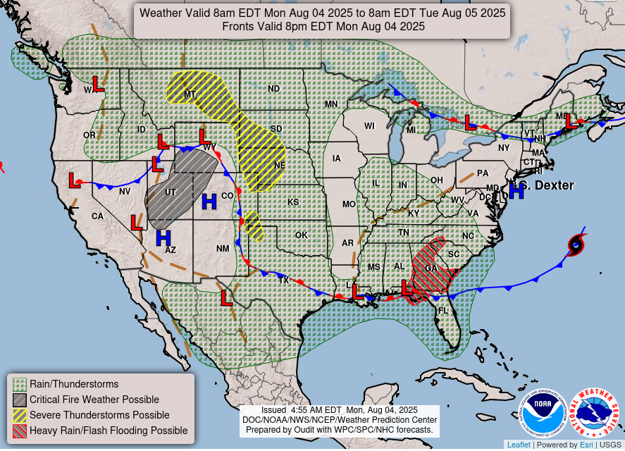 Finishing up with a quick look at today’s weather. The stationary front we have been talking about for a few days will continue to be the focus for thunderstorm activity, with flash flooding possible in the Southeast and some severe thunderstorms in the High Plains region. Hot, dry and breezy conditions will continue to support elevated fire danger concerns, with particularly critical conditions forecast over much of Utah into parts of Wyoming and Colorado. Heat will be most extreme today over the desert Southwest, with an expansion and intensification of the heat still anticipated into the middle of the week.