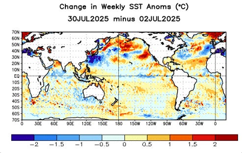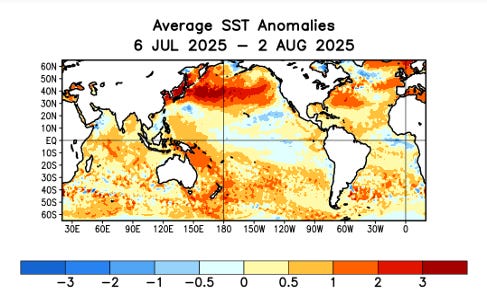 Looking at some of the larger scale trends as we head into August, sea surface temperatures (SSTs) remain above normal over the entire Atlantic, and departures from normal have increased over the most the Atlantic basin south of 30N. The trend has been toward less positive anomalies north of 30N, but SSTs still remain well above normal in this region. There continues to be little signs of any developing El Nino or La Nina to play a major role in the rest of the hurricane season, as equatorial Pacific temperatures have trended slightly below normal over the last few weeks. Overall, conditions seem to continue to support a slightly above normal rest of the season. Colorado State University will release their next seasonal update on Wednesday along with their first 2-week forecast, and I will provide a summary of that later in the week.