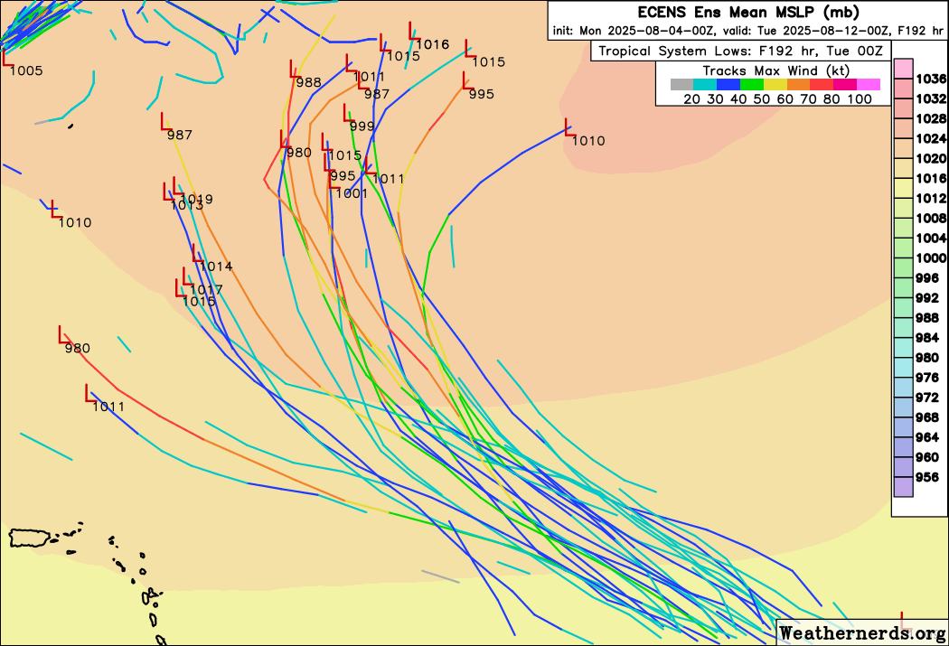 The European ensemble model suggests at least weak development, with a few members showing a more intense system. The model indicates that whatever does develop should move into a weakness in the subtropical high pressure ridge and likely recurve into the north Atlantic.