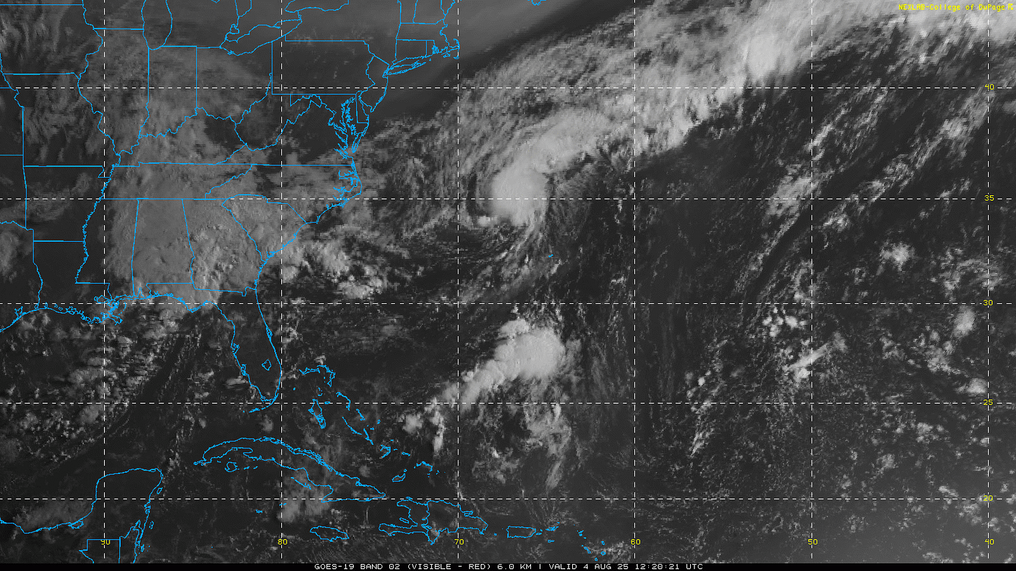 I like to start an examination of the tropics with a visible satellite loop. Most of the action we are focused on today is in the southwest Atlantic, where there are two main areas of interest this morning. The first is recently formed Tropical Storm Dexter, which you can see spinning pretty much due east of Cape Hatteras. Dexter is currently a low end tropical storm, with maximum sustained winds of 45 mph. If you look closely, you can see that most of the brighter thunderstorm clouds are located east of the center. That is indication of upper level westerly wind shear on the system, which blows the storms to the east side of the low pressure center and is a hindrance to intensification.
