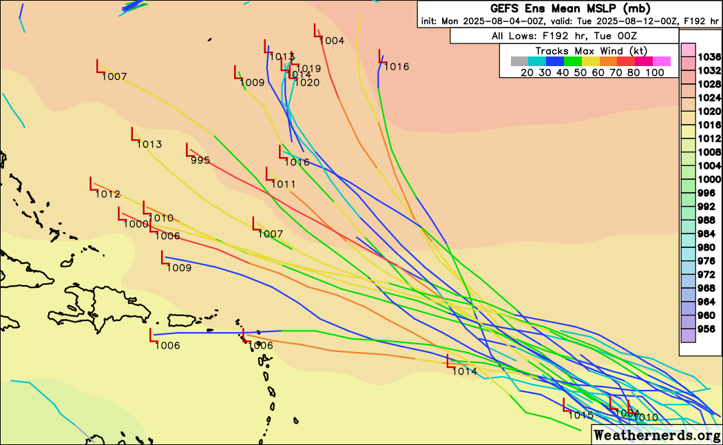 The US Global ensemble (GEFS) has more members suggesting a track farther to the west. For what it’s worth, the AI models are more in line with the European model solutions. Regardless, this system is still at least 4 to 5 days away from any sort of significant development, so there is plenty of time to watch.