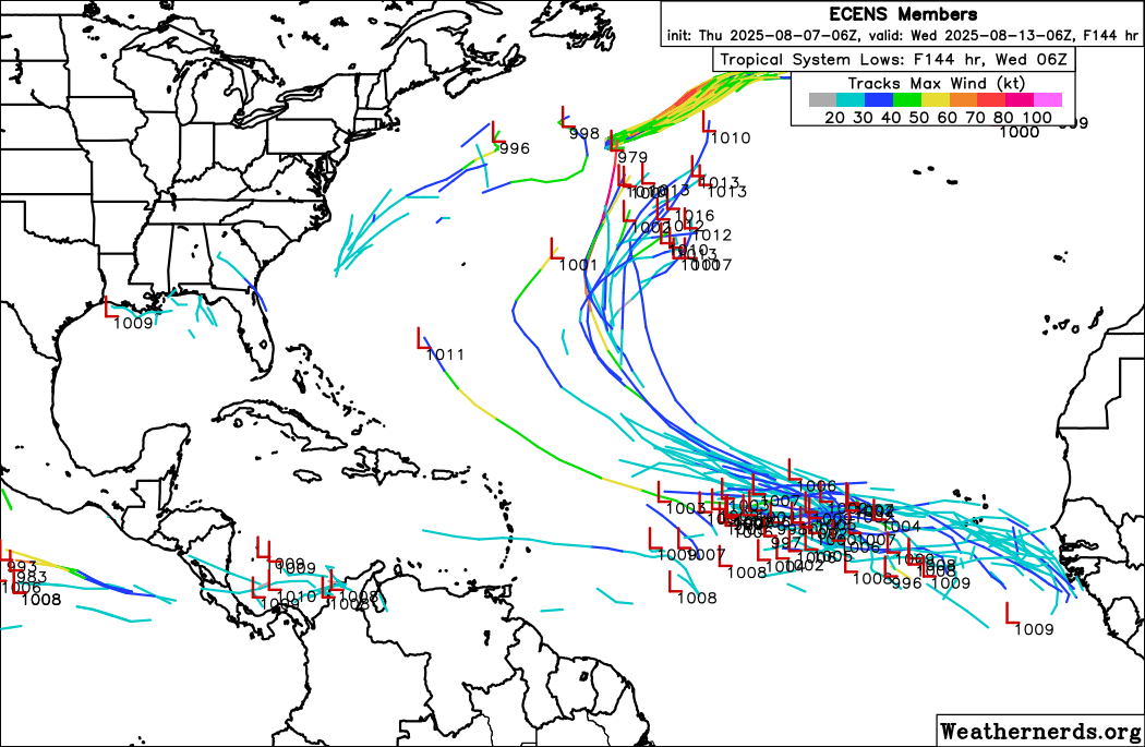 I will say that overall the models appear to me to have become less bullish on this system in the last 24 hours, with only a couple of the 50 European ensemble members showing it becoming more than than a tropical depression. The Google DeepMind AI system does not really have any of its ensemble members showing development at this point. Regardless, it seems almost certain that any system that comes from this will recurve over the Atlantic and remain east even of Bermuda.