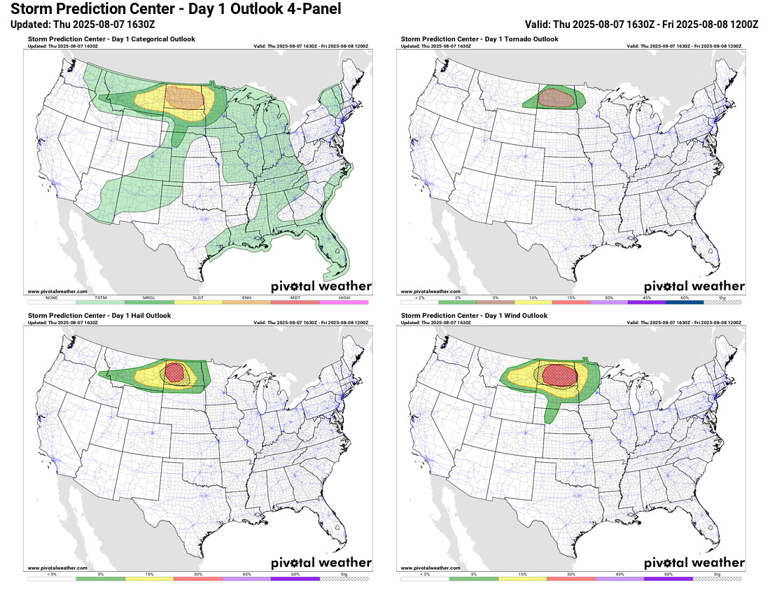That upper level weather disturbance will also be responsible for a significant severe weather risk later today in the northern Plains and focused over much of North Dakota. Scattered supercell thunderstorms are expected to develop over the region with very large hail, wind gusts greater than 70 mph, and tornadoes possible with the most intense storms.
