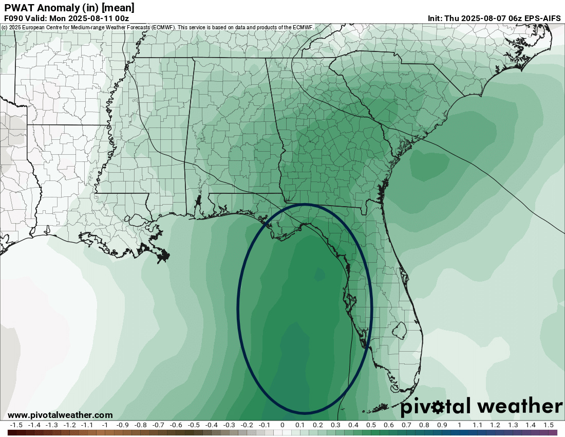 While still not designated as an area of concern by NHC, several members of the European ensemble and the Google AI system continue to show a weak system developing in the eastern Gulf of Mexico this week or early next week from the weak area of low pressure is now near Andros Island in the Bahamas. If nothing else, this system should bring a surge of increased moisture and rainfall into Florida this weekend and Gulf Coast region early next week as shown by the European ensemble precipitable water anomaly above (forecast for Sunday evening).