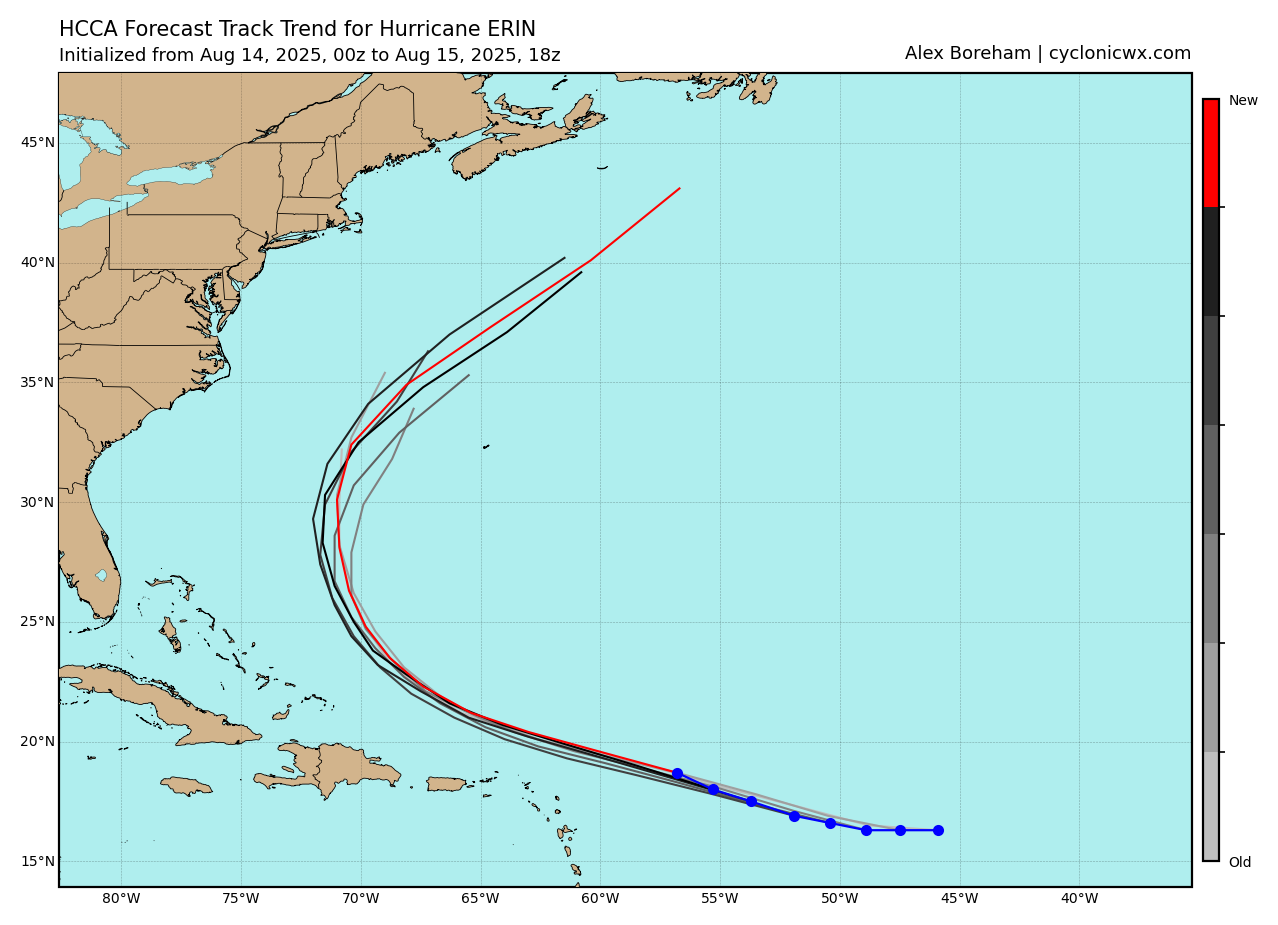 This is an example of the August 15th 1200 UTC morning ensemble runs from the ECMWF and GFS ensembles for Hurricane Erin. Each of these ensemble model systems runs four times per day, so between the hurricane specific models, the global ensembles, and other less utilized global models (e.g., German ICON) and older statistical hurricane models, there are literally hundreds of model forecasts produced every day for each invest and tropical cyclone. This is not even taking into account newer artificial intelligence models which appear to have some skill at hurricane forecasting, particularly the Google AI Deepmind system which is being developed in partnership with NHC (and which NHC discusses as part of their forecast process in tropical cyclone discussions).