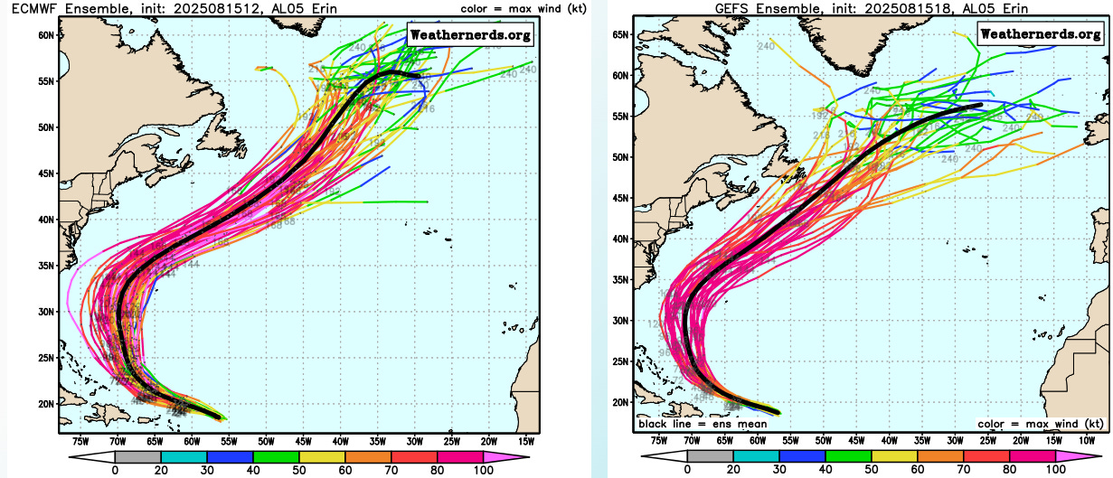 This is an example of the August 15th 1200 UTC morning ensemble runs from the ECMWF and GFS ensembles for Hurricane Erin. Each of these ensemble model systems runs four times per day, so between the hurricane specific models, the global ensembles, and other less utilized global models (e.g., German ICON) and older statistical hurricane models, there are literally hundreds of model forecasts produced every day for each invest and tropical cyclone. This is not even taking into account newer artificial intelligence models which appear to have some skill at hurricane forecasting, particularly the Google AI Deepmind system which is being developed in partnership with NHC (and which NHC discusses as part of their forecast process in tropical cyclone discussions).