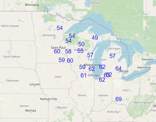 As can be seen in the surface temperature anomaly map a few graphics up, downstream of the West Coast heat, unseasonably cool air will be centered over the upper Midwest and Great Lakes. While currently this airmass does not look as if it will support widespread record low temperatures, on the peak day of the cool weather Thursday, clouds and the cold airmass will likely result in a number of record cool maximum temperatures in this region as shown above.