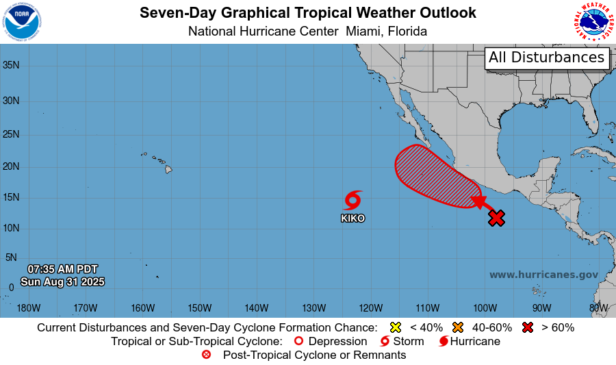 In the tropics, Invest 93E that we were talking about yesterday has become Tropical Storm Kiko in the east-central Pacific. This system is expected to slowly intensify into a hurricane as it moves west into the central Pacific ocean. The long range models suggest at least some risk for it to pass close enough to Hawaii to be of interest to the islands.