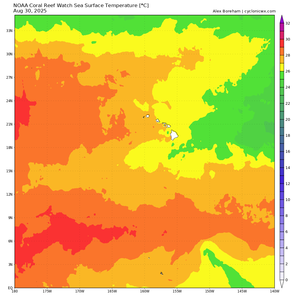 However, in contrast to what we talked about with Hurricane Henriette a few weeks ago and it taking advantage of much warmer than normal sea surface temperatures (SSTs) north of Hawaii, the SSTs south of Hawaii are actually a bit cooler than normal, so even if it moves on a track closer to the islands it will be moving over sub-26C SSTs that would likely promote weakening of any system. Regardless, we will of course watch it.