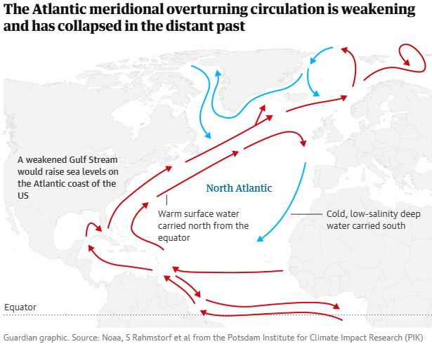 Just this week, a new study was published showing that the probability of a breakdown of the Atlantic Meridional Overturning Circulation (AMOC) — the driver of the Gulf Stream — prior to 2100 is much greater than previously estimated. This particular study found that the probability is as high as 25% even if Paris agreement carbon emissions are used in model simulations — and we are far from reaching those emission goals currently. While obviously this is just one study and other earlier studies showed lower probabilities of AMOC breakdown, AMOC breakdown would be such a calamitous event that even very low probabilities must be taken seriously, as “it would shift the tropical rainfall belt on which many millions of people rely to grow their food, plunge western Europe into extreme cold winters and summer droughts, and add 50cm to already rising sea levels.”