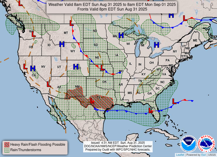 For today’s weather, the central part of the nation and along the Gulf and Southeast coasts will be the primary focus for thunderstorm activity. A slight (level 2 of 4) risk of excessive rainfall is in place from extreme southeast Arizona across much of central and southern Texas for localized intense rainfall that could cause flash flooding.