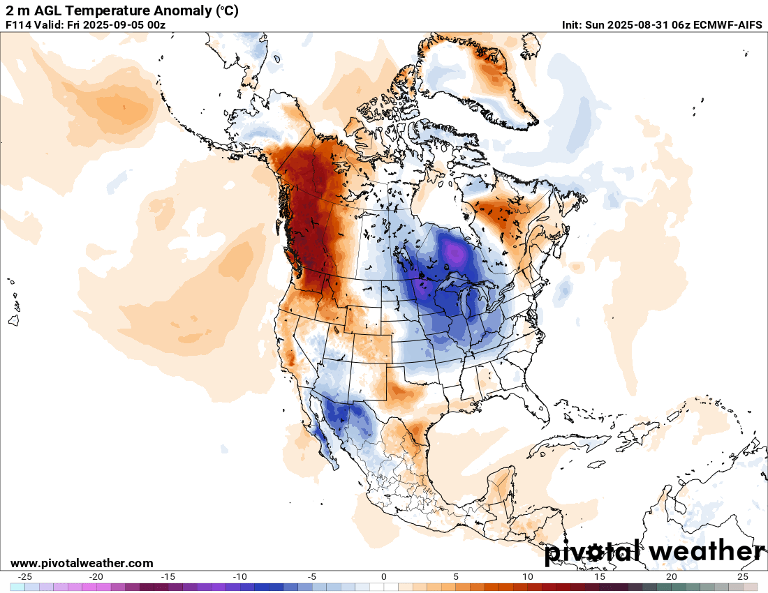 This week, western North America will be seeing record heat, with the heat wave looking to peak in the Wednesday through Friday time period. The all-time September national high temperature for Canada of 40C looks to be in danger as it seems likely that an interior station in British Columbia will reach that level at some point this week.