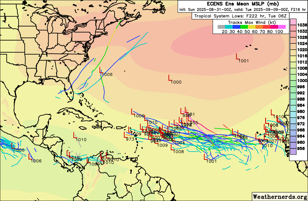 In the Atlantic, NHC continues to show a 30% probability of development on a tropical wave in the far eastern Atlantic. The models suggest a reasonably favorable environment eventually evolving ahead of it, and most of the European ensemble members show above develop at least a tropical depression or storm out of it as it moves west to west-northwest across the Atlantic over the next 7-10 days. The old stationary front from the Gulf into the Southwest Atlantic will continue to support areas of thunderstorm activity that could at some point pose some risk of development, but the situation has not really changed since yesterday and the probability overall is low.