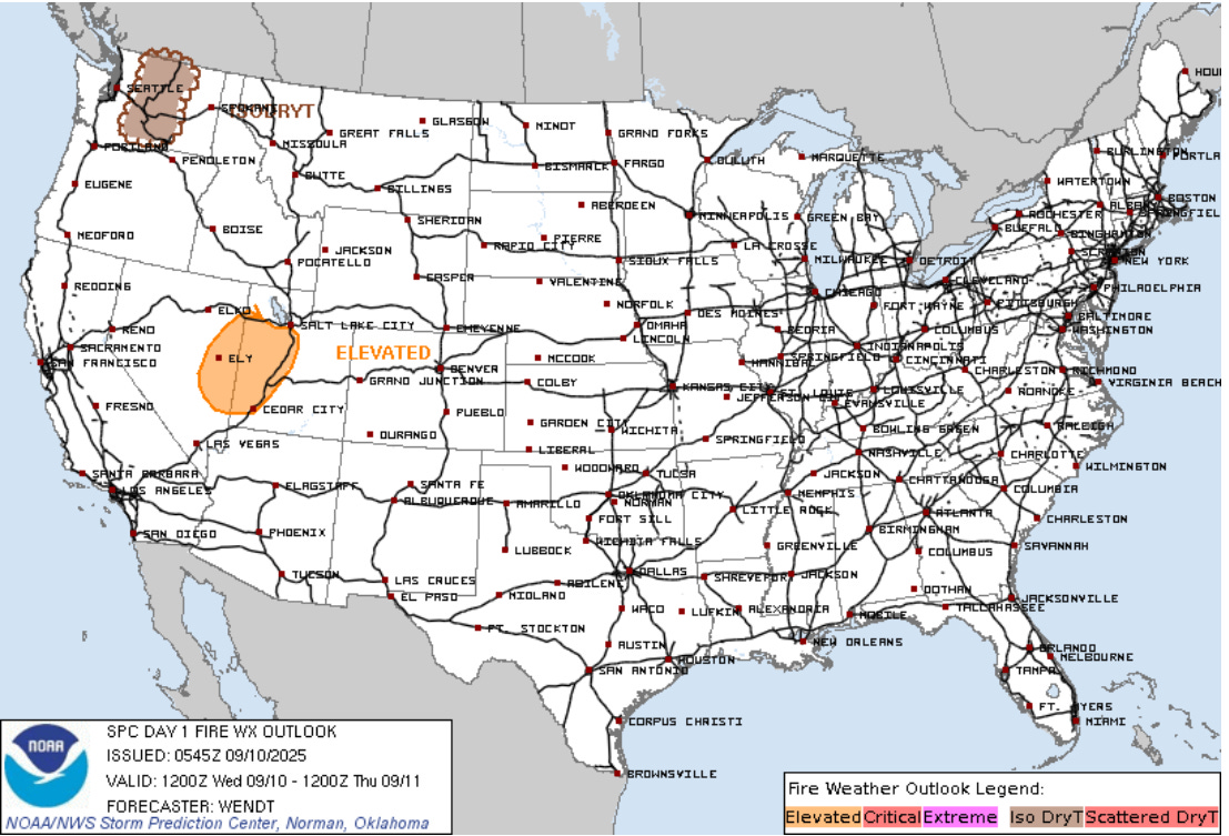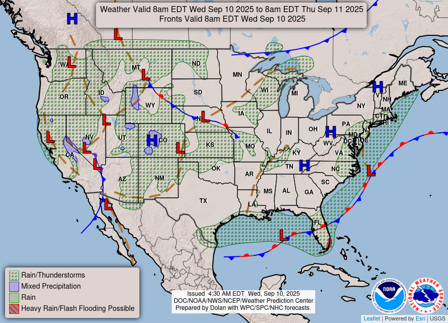 As we approach the middle of September, the weather pattern (for a change) is relatively quiet across the US. With regards to thunderstorm activity, the most focused and widespread activity on Wednesday looks to be in Florida, where a seemingly perpetual stationary front will continue to focus thunderstorm activity. Locally heavy rains could cause some flash flooding, particularly across southern Florida.