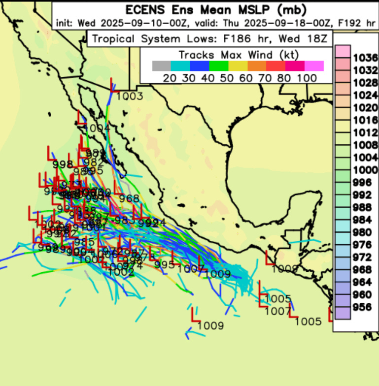 In the tropics, Kiko has weakened to a minimal tropical storm as it passes north of the Hawaiian Islands, though it continues to produce heavy surf and rip currents at beaches in the state. The system we discussed on Monday off the coast of southwest Mexico now has a high chance of tropical cyclone development over the next few days per NHC, and is expected to become a strong tropical storm or hurricane as it moves west-northwest into this weekend as shown in the European ensemble model tracks above. The system could pass close enough to the southern coast of Mexico to cause some rainfall impacts there. We will be monitoring longer term model trends as far as track and any potential impacts to Baja California, although right now most of the model forecasts keep it farther southwest.